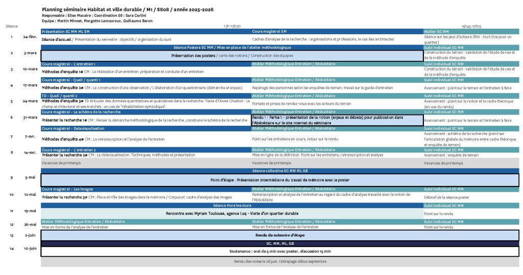 Les enseignements de ce séminaire se fondent sur les acquis du semestre précédent et cherchent à approfondir les réflexions relatives aux processus de projet à l’échelle de l’Habitat et de la Ville durable (conception, programmation, réception, évaluation) face aux impératifs de durabilité : prise en compte de l’injonction à des modes de vie «durables», appropriation des dispositifs techniques, engagement à la réduction des consommations énergétiques, etc. Cette démarche devra interroger les liens entre dispositifs techniques et naturels, pratiques urbaines et microclimat (ilôt de chaleur urbain), et plus généralement la place de l’environnement dans la conception architecturale et urbaine : dispositifs végétaux liés à la production énergétique, présence de nature en ville comme argument pour la lutte contre l’étalement urbain et diminution des émissions de gaz à effet de serre…